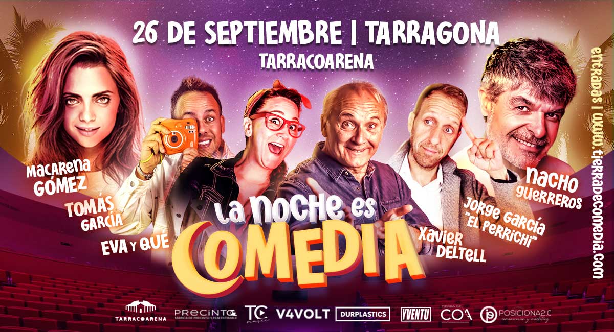 La Noche es Comedia reunirá el próximo 26 de septiembre de 2026 en Tarracoarena, en Tarragona, a los monologuistas: Tomás García, Xavier Deltell, Eva y Qué y Jorge García «El Perrichi». Después de recorrer toda España, por fin llega a Tarragona, de la mano de Tierra de Comedia, un espectáculo único e irrepetible donde las risas están más que aseguradas. Además, la actriz Macarena Gómez presentará junto a Nacho Guerreros este espectáculo único.